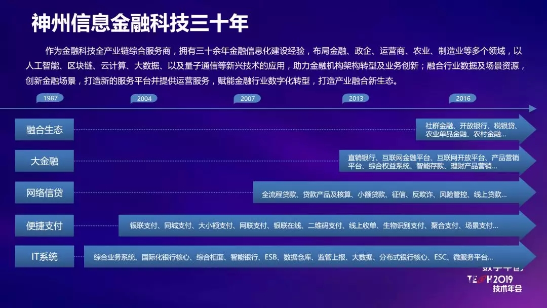 从定义来看,神州信息认为金融科技的发展可追溯到2004年之前。发展到今天,它的业务内涵已覆盖五个层面,这也是它发展的五个阶段。