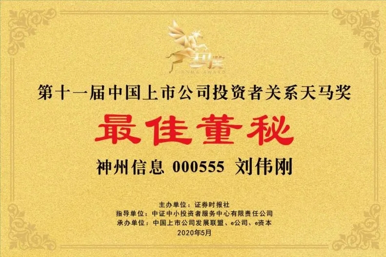 5月13日,由证券时报社主办,中证中小投资者服务中心担任指导单位的“第11届中国上市公司投资者关系天马奖”获奖榜单新鲜出炉。神州信息登榜“最佳投资者关系公司奖”,公司董秘刘伟刚摘得“主板最佳董秘奖”。