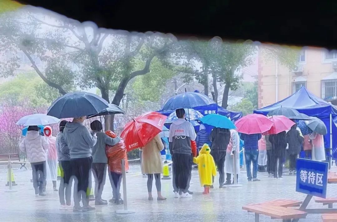 天青色烟雨,核酸在等你。在疫情愈发严重的上海,市民暴雨中排队核酸,小朋友牵着大人的手,默默地等待。