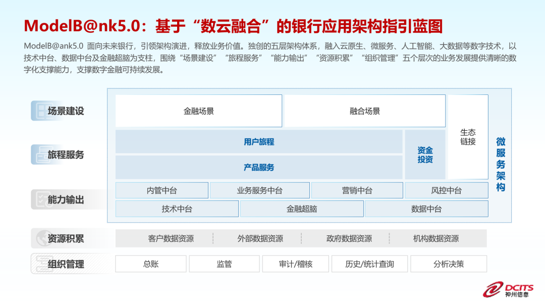在推动银行架构演进发展方面,以ModelB@nk5.0银行应用架构为指引“蓝图”,基于“数云融合”的技术范式,通过独创的五层架构体系,以技术中台、数据中台以及金融超脑为支柱,围绕“场景建设”“旅程服务”“能力输出”“资源积累”“组织管理”五个层次,为业务发展提供清晰的数字化支撑能力,支撑银行的数字金融可持续发展。