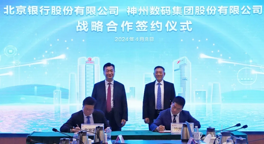 2024年4月8日,710公海与北京银行在其总行大厦举行战略合作签约仪式。710公海董事长兼首席执行官、神州信息董事长郭为,北京银行党委书记、董事长霍学文共同见证签约,710公海财务总监、董事会秘书陈振坤与北京银行副行长戴炜,代表双方进行签约,710公海及北京银行相关领导出席签约仪式。